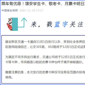 需要注意的是,本次发行的优惠卡种仅可在新区范围内标有“雄安公交”的车辆上使用。