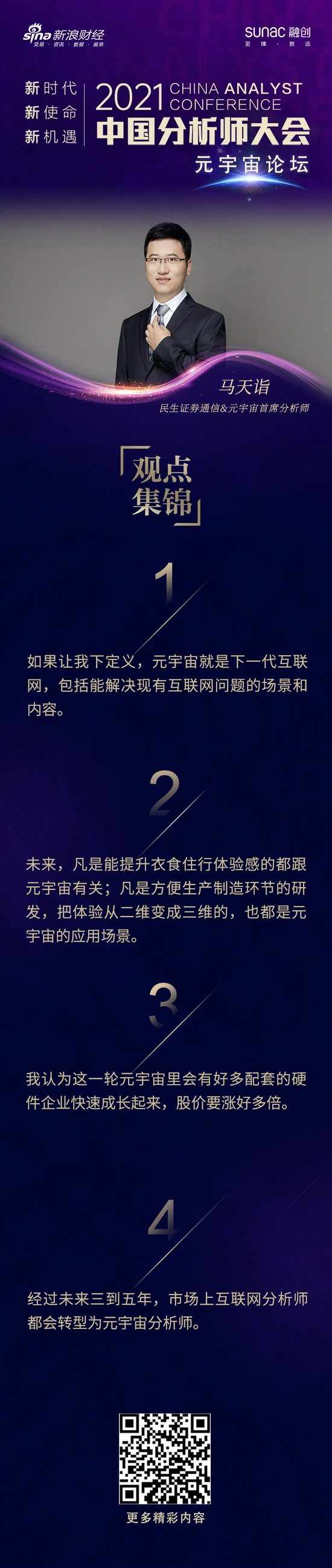 马天诣:首先,站在二级的证券研究所的角度来看,绝大部分研究元宇宙的分析师是以传媒为主,通信分析师也有一些,剩下的相关的可能就会比较少一点。为什么是这样呢?原因有两个:第一,元宇宙的核心来自于网络体系的建立和社交体系的建立,所以它的底层的原理是通信的本质。第二,为什么传媒的人研究的相对比较多,因为这里面涉及到大量内容的创新,从二维平面变为三维平面,带来一些内容的变化以及营销体系的变化,比如虚拟人等等,它是一个内容创作的过程,所以符合内容公司、游戏公司这样对应的一个场景。第三,我的理解是,观点鲜明一点,即使大家说我是第一位元宇宙分析师,我认为绝对不是最后一位,我的判断是,经过未来的三年到五年的时间,市场上不会再出现互联网分析师,互联网分析师都会转型变成元宇宙分析师。如果拉开整个卖方20几年的发展规律,你会发现,其实在互联网之前是没有互联网分析师的,包括中国的资本市场对于海外的研究,就是在过去的3、4年时间达到相对的一个顶峰。但我刚才讲,顶峰过后可能就是相对应的回落。