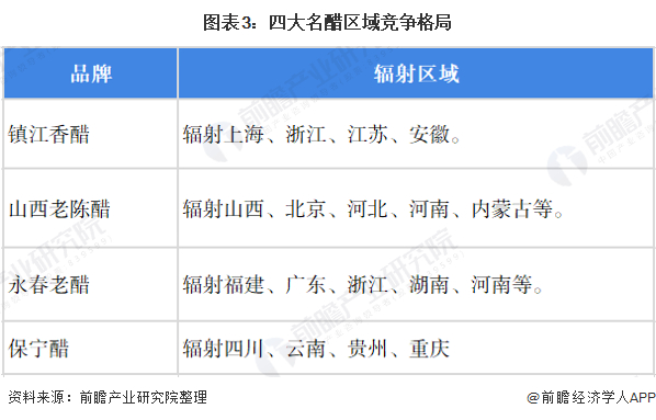 我国四大名醋有山西老陈醋、镇江香醋、保宁醋、永春老醋,因其发源地和口味的差异,其辐射区域各有不同。其中镇江香醋辐射区域在华东地区;山西老陈醋辐射区域主要在华北地区;永春老醋的辐射区域主要在华南地区,保宁醋的辐射区域主要在西南地区。
