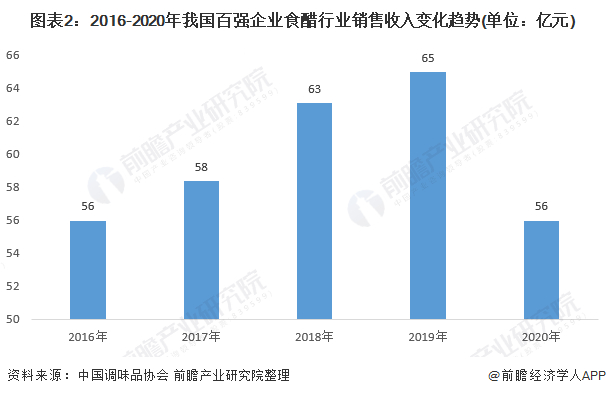 中国调味品协会数据显示,2016-2019年我国调味品百强企业中,食醋行业销售收入均呈逐年上升趋势,2019年达到65亿元,占调味品行业总销售收入比重的7%。2020年,受疫情影响,食醋产量有所下降,初步估计,2020年食醋行业销售收入为56亿元。
