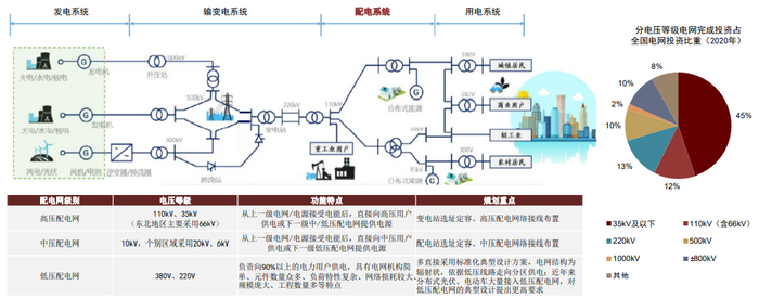 配电网是指从输电网和各类发电设施接受电能,通过配电设施就地或逐级分配给各类电力用户的110kV及以下电力网络,是联系能源生产和消费的关键枢纽。目前,配电网仍是我国电网中相对薄弱的环节,整体自动化率、供电可靠率、农网与城网的结构性差距亟待改善,同时,在分布式电源以及新能源车等多样终端接入配电网、用户与电网供需互动加深的背景下,配电网的发展任重道远。综合来看,我们认为配电网将成为构建新型电力系统的关键环节之一。