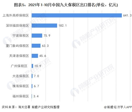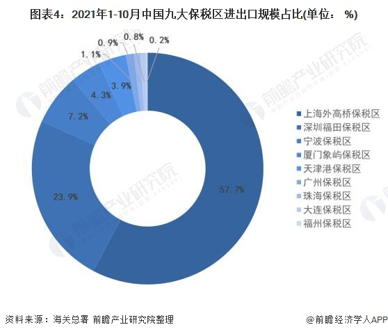 2021年1-10月,上海外高桥保税区以8434.8亿元的进出口规模位列全国保税区首位,同比增长22.1%,占全国保税区进出口总规模的比重为57.7%;其次是深圳福田保税区进出口总额3495.9亿元、宁波保税区进出口总额1047.9亿元,占比分别为23.9%、7.2%。前三保税区进出口总规模占比达到89%。