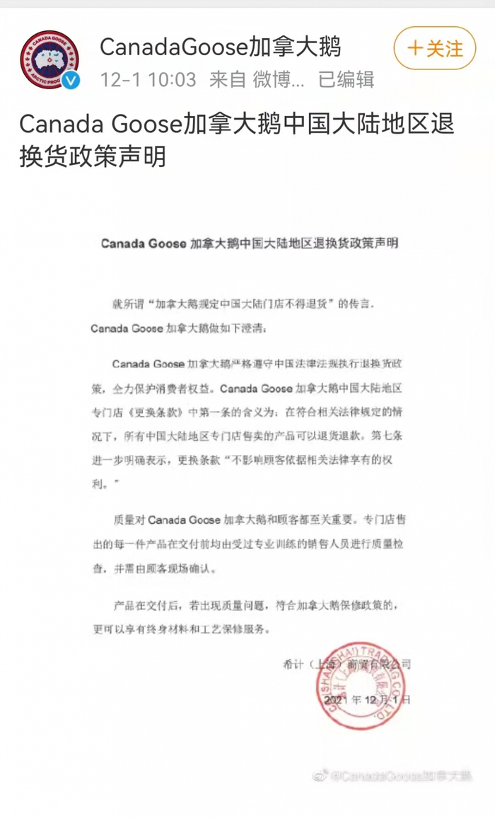 当天,加拿大鹅在官方微博发布声明称,在符合相关法律规定的情况下,所有中国大陆地区专门店售卖的产品可以退货退款。专门店售出的每一件产品在交付前均由受过专业训练的销售人员进行质量检查,并需由顾客现场确认。产品在交付后,若出现质量问题,符合加拿大鹅保修政策的,可以享有终身材料和工艺保修服务。