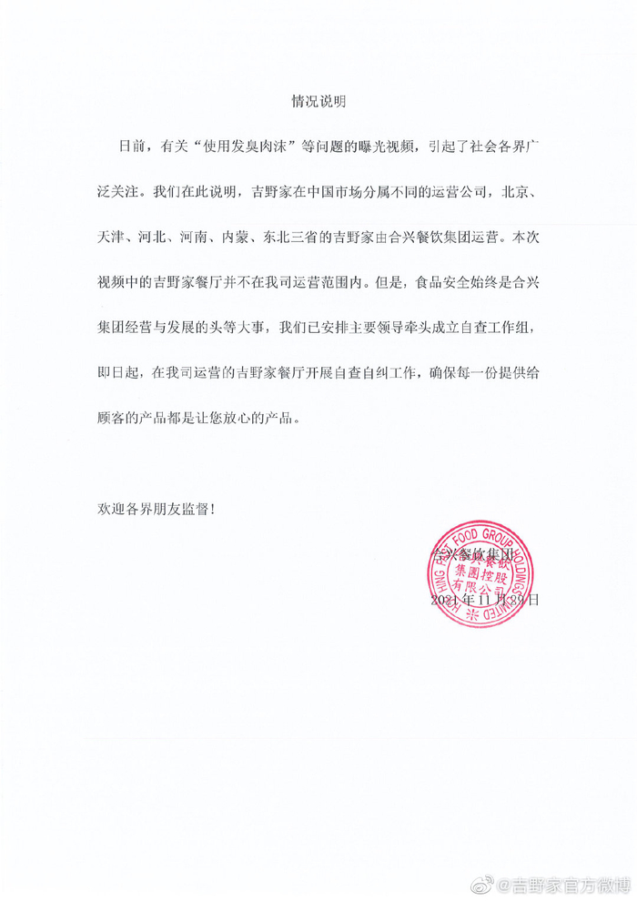 11月30日,吉野家运营主体之一的合兴集团(00047.HK)发布声明称,“本次视频中的吉野家餐厅并不在我司运营范围内”,并表示目前已成立自查工作组,将在合兴餐饮集团运营的吉野家餐厅开展自查自纠工作。