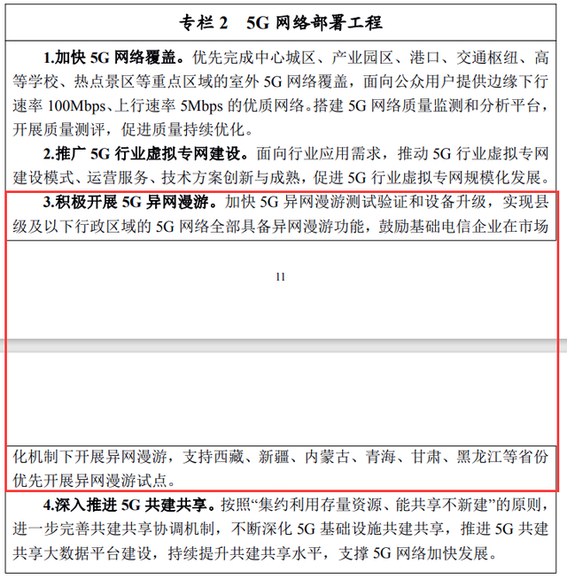 加快 5G 异网漫游测试验证和设备升级,实现县级及以下行政区域的 5G 网络全部具备异网漫游功能,鼓励基础电信企业在市场化机制下开展异网漫游,支持西藏、新疆、内蒙古、青海、甘肃、黑龙江等省份优先开展异网漫游试点。