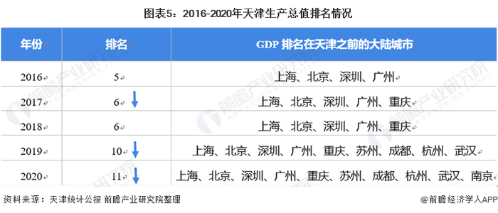 2019-2020年,天津在全国主要城市的GDP排名中,排名一掉再掉,直至2020年跌出前十。2016年天津的GDP在中国城市排名中排名第五;2017年,重庆反超天津,天津在中国城市GDP排行榜中排名下降1位;2018年,天津全年地区生产总值为13362.9亿元,落后于上海、北京、深圳、广州、重庆,位列第六;2019年,天津全年地区生产总值为14055.5亿元,同时被苏州、成都、杭州、武汉超越,略高于南京,位列第十位。2020年天津GDP排名又出现下降,跌出全国前十。