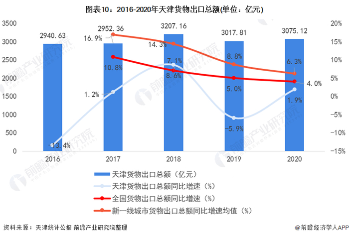 天津作为中国直辖市之一,天津港是中国北方重要的对外贸易口岸,在全球外贸形势总体回暖的背景下,持续推进“一带一路”,加快加工贸易转型升级步伐,提高加工贸易的质量和附加值,延长加工贸易产业链,提升在全球价值链中的地位,推动加工贸易从“大进大出”向“优进优出”转变。2020年,天津货物出口总额幽邃上涨,为3075.12亿元。