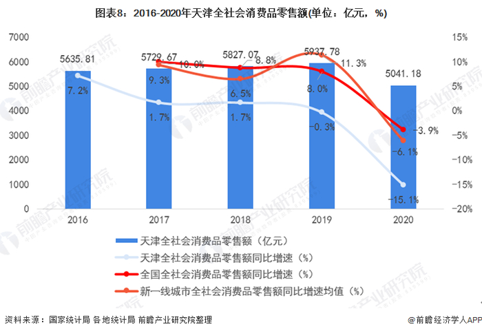 2016-2019年,天津全社会消费品零售额呈现逐年上涨的趋势,但是2020年全社会消费品零售额出出现下降。2020年疫情爆发,天津居民消费意愿下降,天津全社会消费品零售额也较2019年下降15.1%,为5041.18亿元。降幅较全国全社会消费品零售额以及新一线城市全社会消费品零售额大。并且,2020年天津全社会消费品零售额低于新一线城市全社会消费品零售额均值。