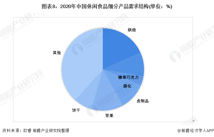 中国休闲食品行业的零食品类丰富,既有西方的糖果、膨化饼干、烘焙食品,又有中国传统的卤制品、坚果炒货、果脯蜜饯。前瞻根据欧睿发布数据对2020年中国休闲零食行业需求结构进行测算,烘焙糕点仍占据市场最大份额,占比达到18.3%;其次是糖果巧克力;坚果、卤制品市场份额有所提升,比例分别达到12.5%、10.8%。