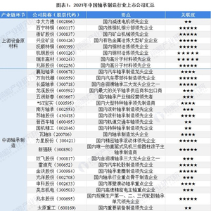轴承制造是我国体量较大的高端装备零部件市场,从产业链来看,我国轴承制造上游主要上市企业钢铁冶炼、设备生产等供应商;中游包括汽车轴承、轨道交通轴承等制造商,其中瓦轴B(200706)是国内轴承制造龙头企业,另有南方轴承(002553)、苏轴股份(430418)等细分市场的领先企业;下游应用领域广泛,主要涉及汽车、重工业、航天等行业。具体的汇总如下: