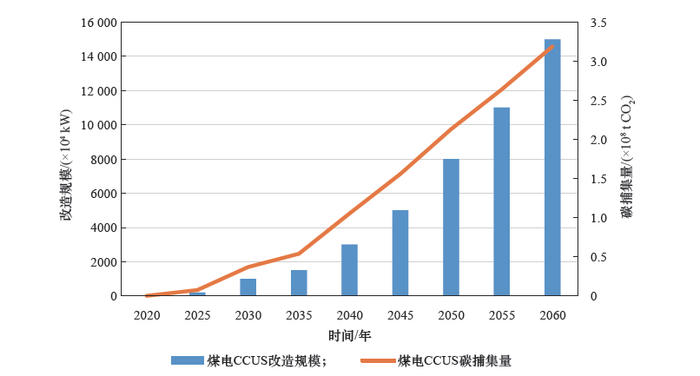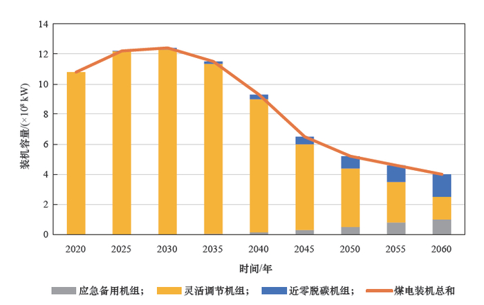 ③“减容减量”阶段。2030 年以后,煤电装机和发电量稳步下降,一部分逐步退出常规运行而作为应急备用;远期加装CCUS 设备,逐步增加“近零脱碳机组”并形成碳循环经济发展新模式;2060 年煤电装机降至4×108 kW,相应占比下降为5.6%。