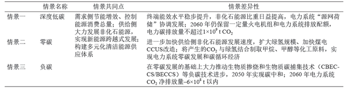 以2060 年为目标年,考虑电力系统不同的碳减排责任、减排关键举措的不同实施力度,设计了电力系统深度低碳、零碳、负碳3 类转型发展情景(见表1),剖析实现碳中和不同路径下存在的重要问题,推演各种发展路径的可行性及面临挑战。
