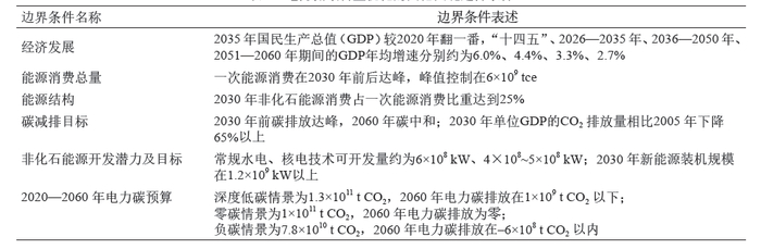 电力低碳转型路径优化除了受电力需求影响以外,还受到经济发展目标、能源需求、非化石能源结构占比、非化石能源开发潜力及目标、碳减排关键目标、电力碳预算等关键边界条件约束(见表2)。