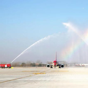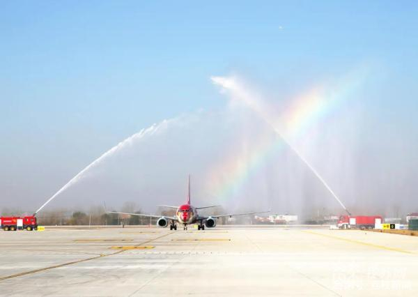 上午9点40分左右,由北京大兴飞往连云港花果山机场的航班缓缓降落,在跑道上滑行,通过“水门”,这也是花果山机场首架落地航班。