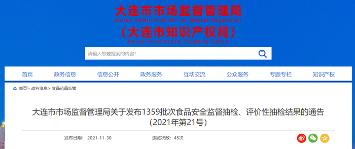 大连市市场监管局公布1359批次食品安全监督抽检、评价性抽检结果:合格率97.79%