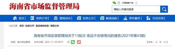 中国质量新闻网讯 2021年11月30日,海南省市场监督管理局网站发布关于13批次食品不合格情况的通告(2021年第43期)。