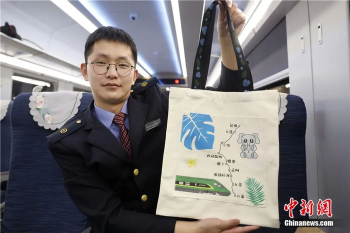 2021年11月,在“中老铁路试乘体验采访活动”中,乘务员展示中老铁路文创产品。中新社记者 李嘉娴 摄