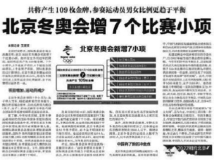 2018年7月20日《北京日报》11版报道,北京2022年冬奥会将新增7个比赛小项,成为冬奥历史上女子比赛项目最多的一届。
