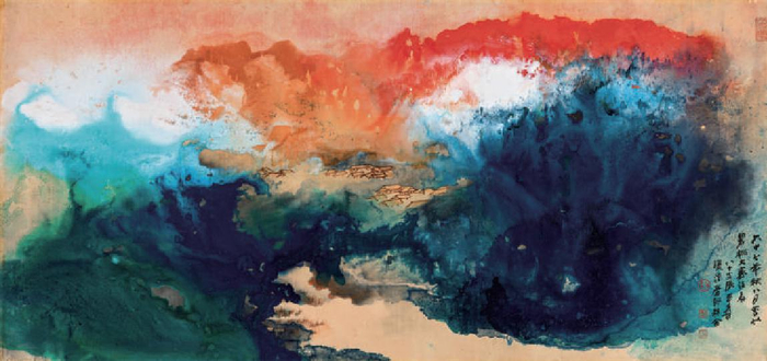 1950年代,张大千漂洋过海定居巴西,在欧美乃至世界艺术舞台上崭露头角,亦在艺术交流中感受缤纷想象与浪漫情调的艺术氛围,在异国的自然人文艺术土壤中汲取新的养分,他再次被激发出澎湃的动能,一个从观念到形式全然属于其自己的风格与态度逐渐成形,一个以墨彩在画面上晕湿流动、渲染重叠的画法就此确立,这就是张大千创建的“泼墨泼彩画风”。这种画风削弱了画面中线条的地位,强化墨与色的表现力,打破了中国画“笔主墨随”的传统程式,对笔、墨、色的传统关系进行了重塑。