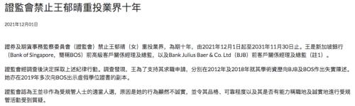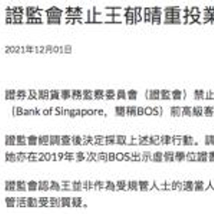 12月1日,香港证监会(“证监会”)公布一项处罚决定,对新加坡银行前大中华与北亚及台湾小组总监兼高级客户关系经理王郁晴做出禁业10年的处罚,原因正是证监会调查发现王郁晴在求职时学历造假。