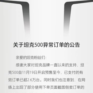 11月27日,坦克品牌在《关于坦克500异常订单的公告》中称:“订单系统中存在疑似200余例多次下单的情况。同时升级交付确认流程,自11月28日起,对新增订单,下定人与实际收货人不匹配,且无法证明直系亲属或者限牌城市牌照车辆租赁关系的订单,则认定为无效订单。”