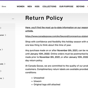 澎湃新闻注意到,外界的质疑主要有两点,一是其门店所规定“不得退货”的条款是否合理,是否属于霸王条款;二是加拿大鹅官网显示,其产品在加拿大、美国等国家均支持30天内无理由退换货,这种截然不同的退换货规定,是否存在“双标”。