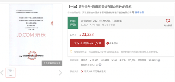 近日,京东司法拍卖平台信息显示,石家庄中级人民法院将于1223日、24日两天对晋州恒升村镇银行60%股权、藁城恒升村镇银行30%股权进行分笔拍卖,合计起拍价分别为28万元、1800万元。