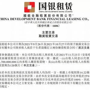 11月23日,国银租赁发布公告称,公司作为出租人,与承租人芯恩(青岛)集成电路有限公司最新签订了一项融资租赁合同,以先购买设备再回租的方式向青岛芯恩提供融资27亿元。