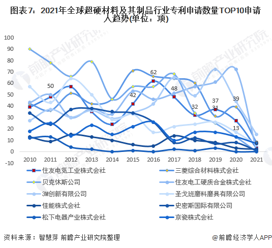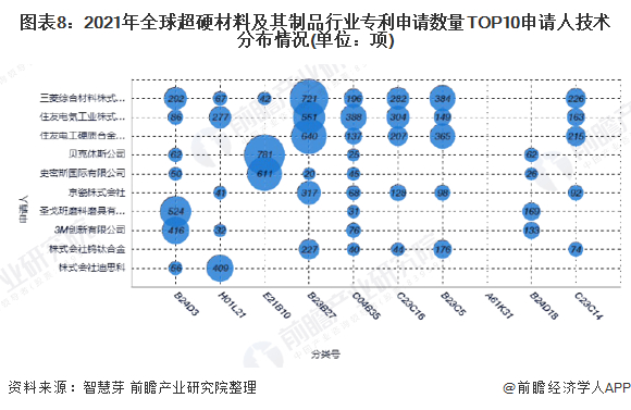 全球超硬材料及其制品行业专利申请数量TOP10申请人分别是住友电気工业株式会社、三菱综合材料株式会社、贝克休斯公司、住友电工硬质合金株式会社、3M创新有限公司、圣戈班磨料磨具有限公司、佳能株式会社、史密斯国际有限公司、松下电器产业株式会社、京瓷株式会社。