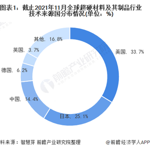 目前,全球超硬材料及其制品第一大技术来源国为美国,美国超硬材料及其制品专利申请量占全球超硬材料及其制品专利总申请量的33.7%;其次是日本,日本超硬材料及其制品专利申请量占全球超硬材料及其制品专利总申请量的25.1%。中国排名第三,其超硬材料及其制品专利申请量占比为14.4%。