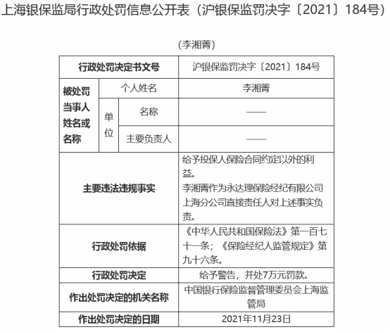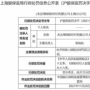 原标题:永达理保经上海分公司违法遭罚 给予投保人合同外利益