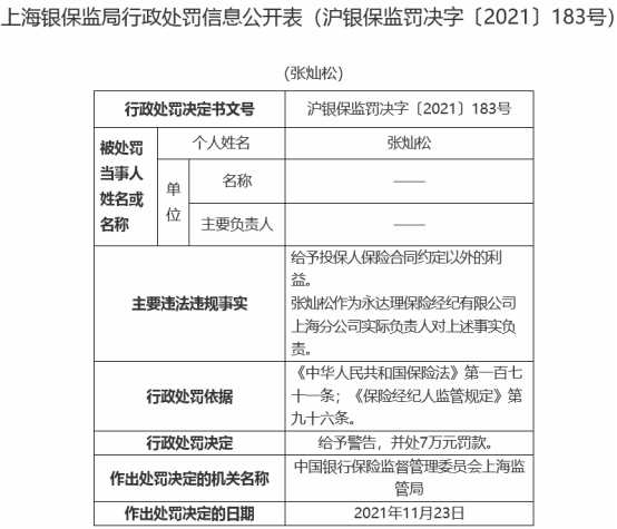 张灿松作为永达理保险经纪有限公司上海分公司实际负责人对给予投保人保险合同约定以外的利益事实负责,中国银保监会上海监管局依据《中华人民共和国保险法》第一百七十一条,《保险经纪人监管规定》第九十六条,给予张灿松警告,并处7万元罚款。