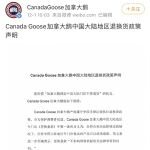 12月1日上午,加拿大鹅官方微博回应称,Canada Goose加拿大鹅中国大陆地区专门店《更换条款》中第一条的含义为:在符合相关法律规定的情况下,所有中国大陆地区专门店售卖的产品可以退货退款。