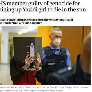 德国新闻社(DPA)援引首席法官克里斯托弗·科勒(Christoph Koller)的话说,这是世界上第一个因ISIS系统性迫害雅兹迪宗教少数群体而被判种族灭绝罪的定罪。