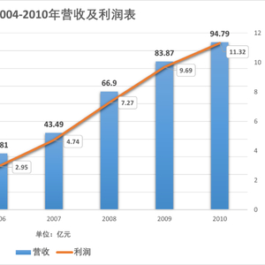 2004-2010年,李宁的营收步步高升,由18.78亿一路上涨至94.79亿;净利润也从1.33亿暴涨至11.32亿元。
