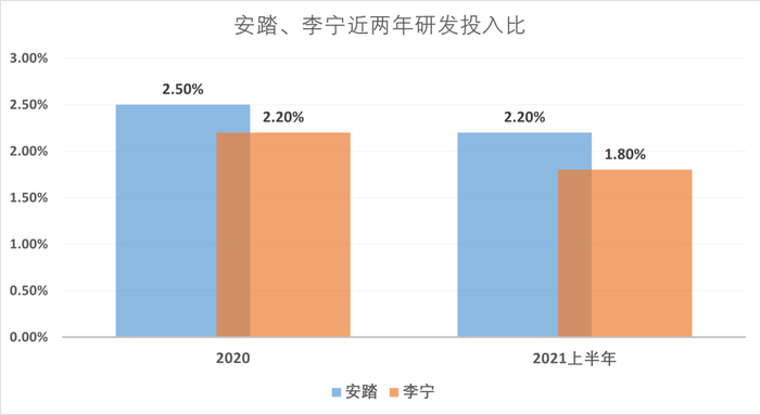 2020年,李宁的研发投入仅为3.23亿元,约占营收的2.2%,安踏的研发投入则为8.78亿元,约占营收的2.5%;2021年上半年,李宁研发投入仅占营收的1.8%,安踏的研发投入则占比2.2%。