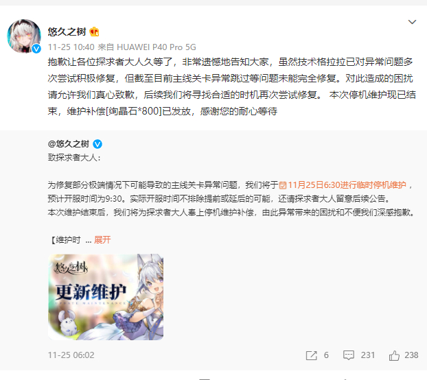 11月27日,《悠久之树》的日常bug环节之中出现了影响最恶劣的bug——保底可以通过单抽无限触发。