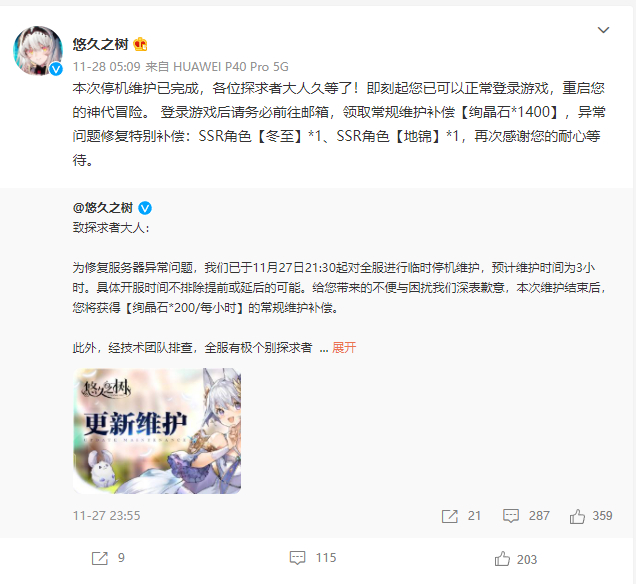 11月28日凌晨4:00,官方宣布维护结束。至此《悠久之树》的开服bug事件正式告一段落。