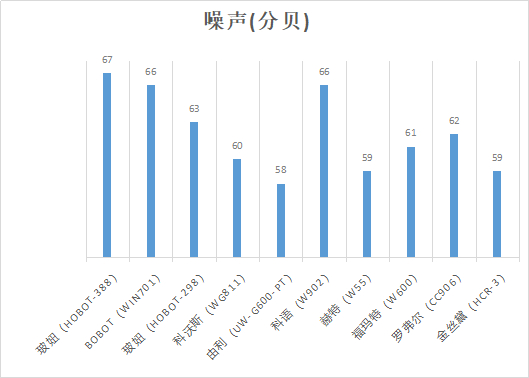 玻妞(HOBOT-388)、BOBOT(WIN701)、科语(W902)3款噪声超过65dB。