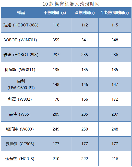 清洁效率差异较为明显。清洁时间最长的BOBOT(WIN701)样品需要348秒才可擦拭完成一面玻璃,耗时最短的玻妞(HOBOT-388)样品仅需115秒。