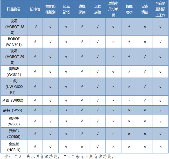 对样品的机身尺寸、整机质量、清洁覆盖率、清洁效率、噪音、吸附力、电池续航、能耗、功能检查9项性能指标进行测试和比较。