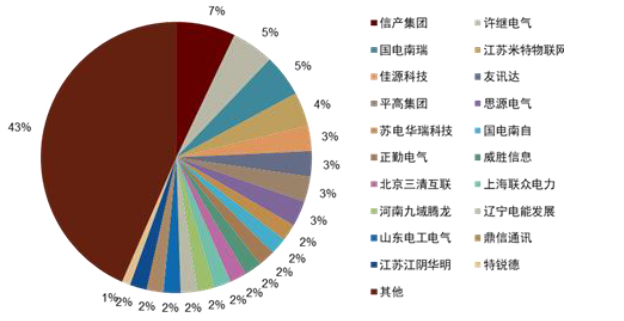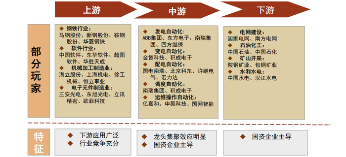 ►电力自动化产业链中游:集中度高,国资企业为主要参与者。中游行业集中度高,主要的参与者为具有国资背景企业,例如国电南瑞和许继电气,在细分领域和区域有民营企业进入。