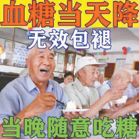 在宣传语上,商家也极尽吸睛之能事。降糖的“神医古方”有30年、40年,甚至50年历史。配方来自日本、美国、中国、泰国……降糖效果上,多为一盒见效、三天“断根”。更有甚者,干脆放上一群老者吃着蛋糕笑逐颜开的图片,宣称“当晚随意吃糖”。若没效?商家则比赛着赌咒发誓,从不降赔10亿,到不降赔一千亿,甚至“拿命保证”、不降全院火葬场。