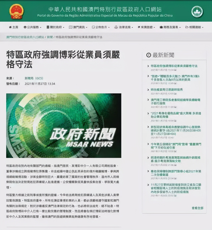 澳门特区政府重申,对于涉嫌违反澳门法律规定的行为,也必将依法追究,绝不姑息