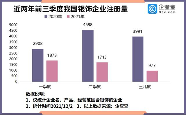 2021年前11月,我国新增银饰相关企业5052家,同比减少160.69%。今年前三季度新增银饰相关企业明显少于去年。一季度新增银饰企业1873家,二季度新增1713家,三季度新增977家。