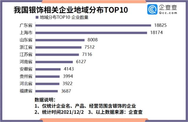 银饰企业区域分布:广东最多,其次是上海、山东