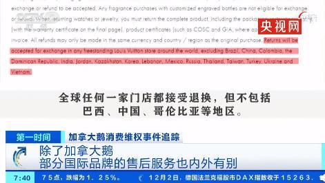 据央视报道,除了“加拿大鹅”,一些被中国消费者追捧的其他国际品牌,在售后服务上,也存在内外有别的现象。横向对比了几个品牌在中国的销售政策后发现,知名奢侈品牌路易威登(LV)在中国大陆是7天内可以退货,30天内可换货,但是在美国、加拿大就可以30天内退货。该品牌在这些国家退换货政策的最后,还专门标注了这样一句话:全球任何一家门店都接受退换,但不包括巴西、中国、哥伦比亚等地区。
