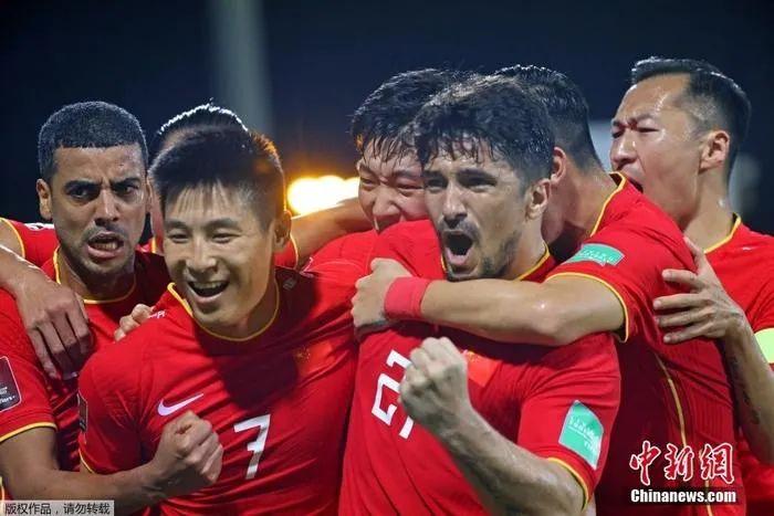 1:1战平阿曼的比赛中,先入一球的国足队员们兴奋庆祝。