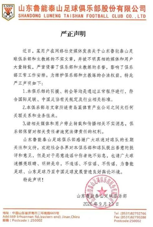 山东泰山队曾为李霄鹏身陷被举报风波发布声明。