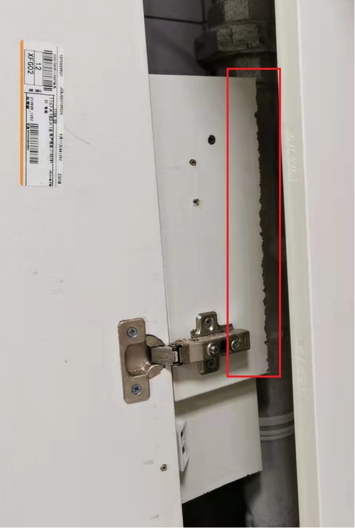 同时,姚女士认为柜体柜门固定处设计也存在问题。姚女士回忆:“当时装橱柜时,安装师傅按照设计图纸根本没法装,给设计打电话,设计让师傅自己想办法解决。这导致原本封边的木板被裁,露出的木材既不美观,还会使有害气体放出。”
